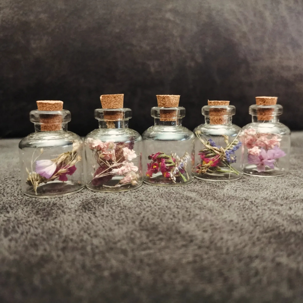 Elk flesje bevat een unieke selectie van door ons zelf gedroogde bloemen, zorgvuldig samengesteld om een mooi geheel te vormen.