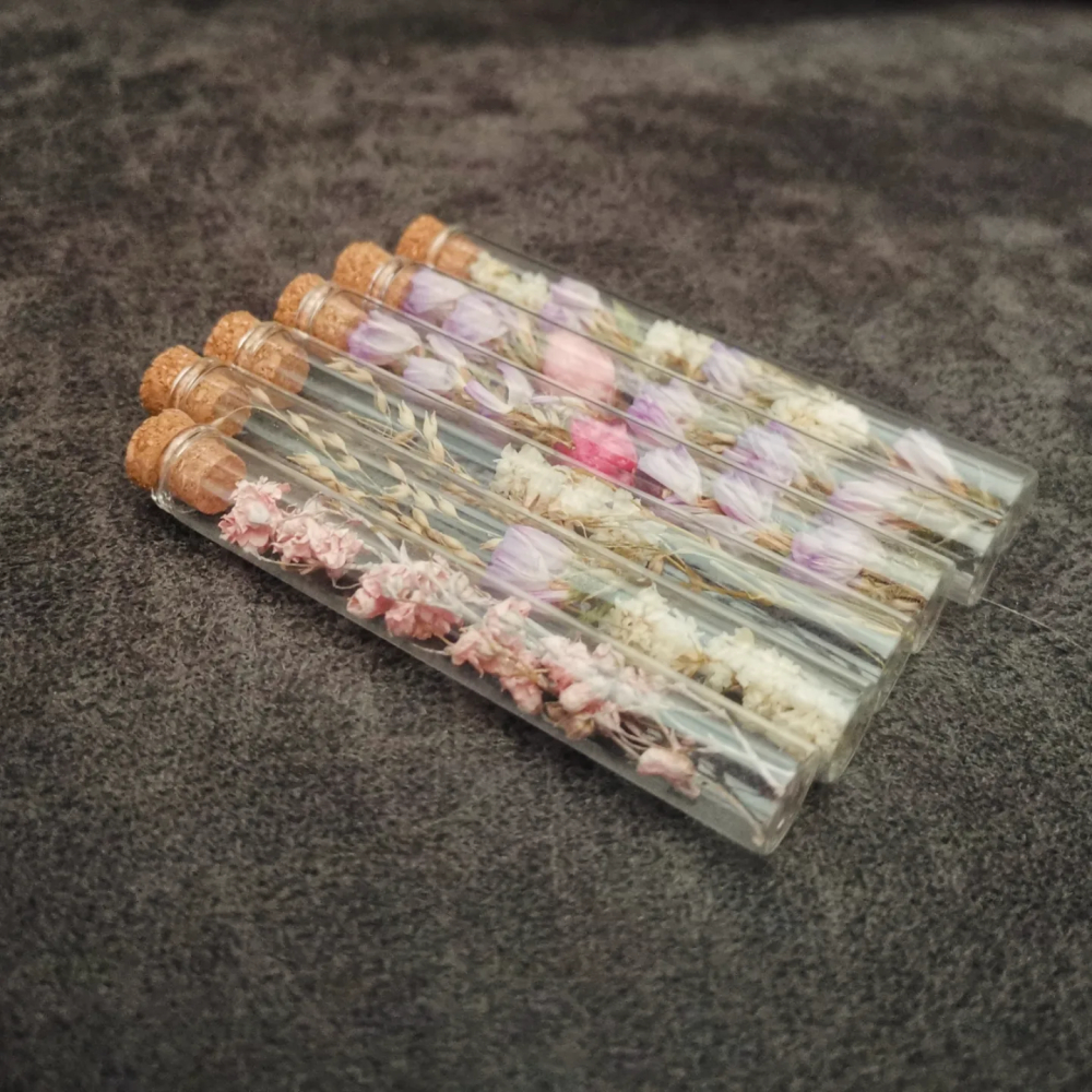 Elk flesje bevat een unieke selectie van door ons zelf gedroogde bloemen, zorgvuldig samengesteld om een mooi geheel te vormen.