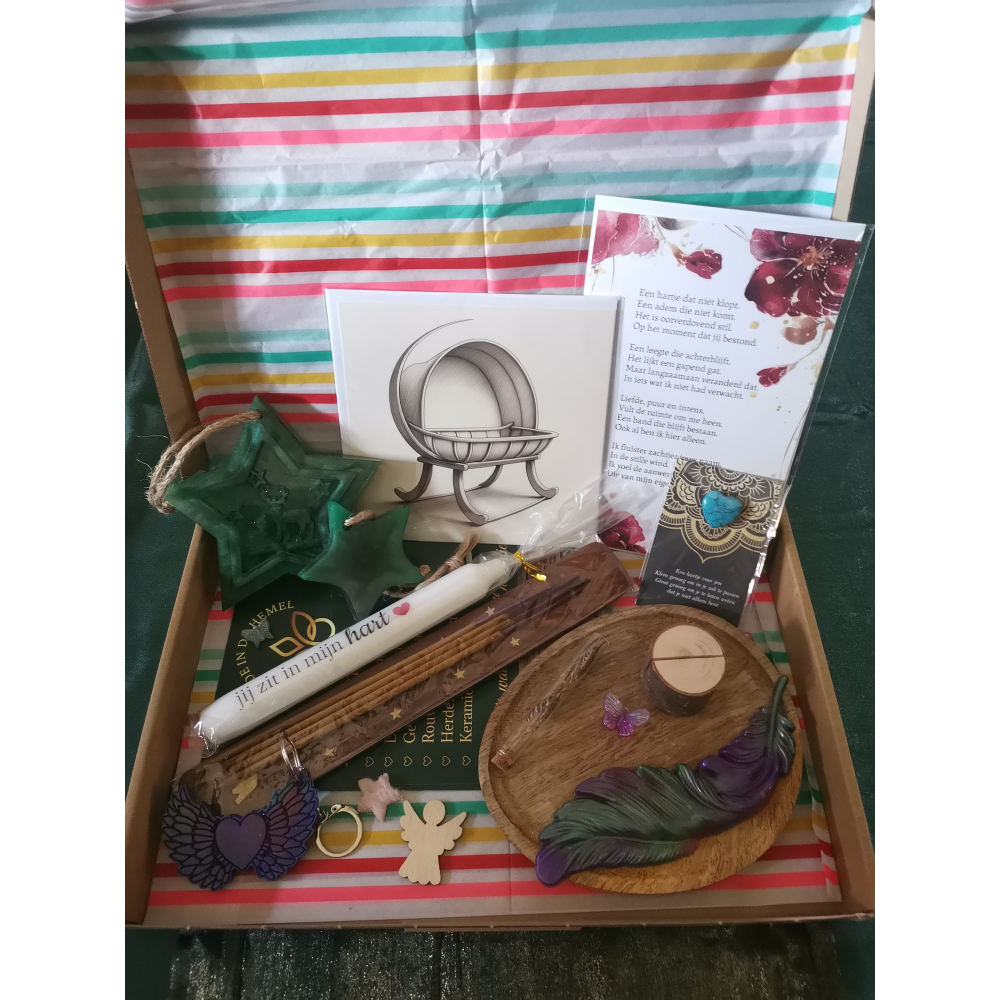 Dit troostdoosje is gevuld met zorgvuldige en betekenisvolle producten die ouders steun en troost bieden na het verlies van hun kind.