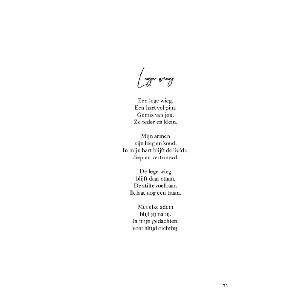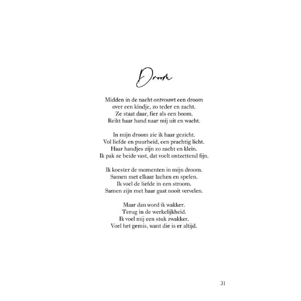 De gedichten in deze bundel omschrijven de rauwe rouw die je kan ervaren na verlies. Maar ook bieden ze troost en stralen ze trotsheid uit. Dit komt allemaal door de liefde die er is voor een kind dat er niet meer is.