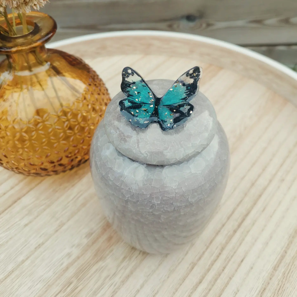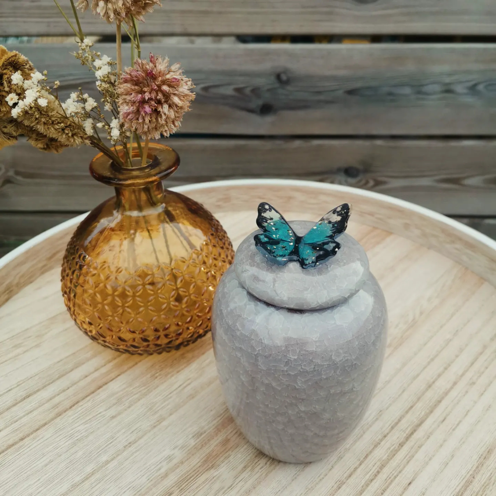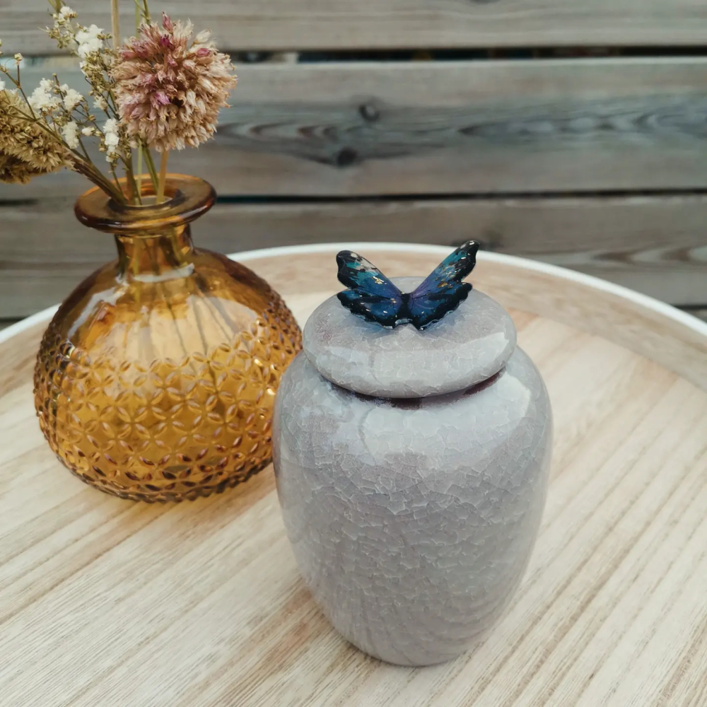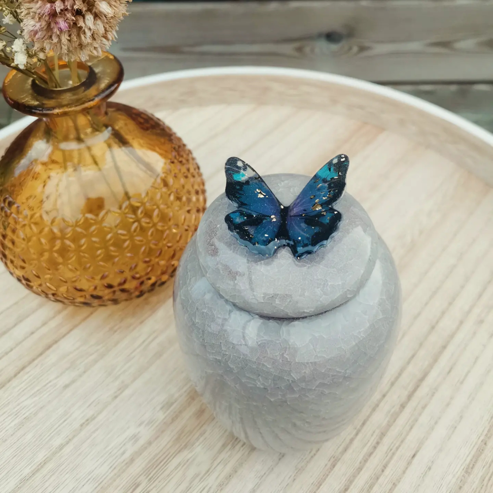 Keramieken urn met vlinder bovenop. Op iedere urn zit een andere vlinder.