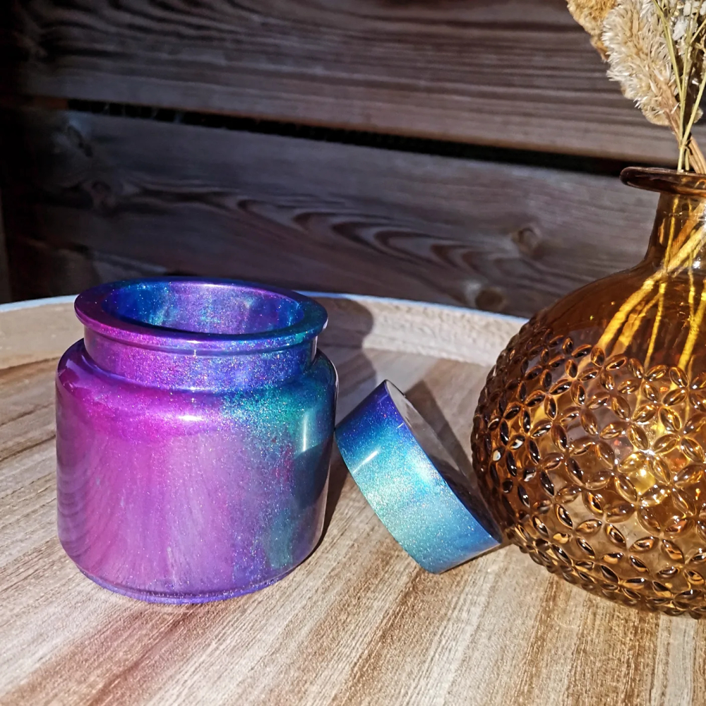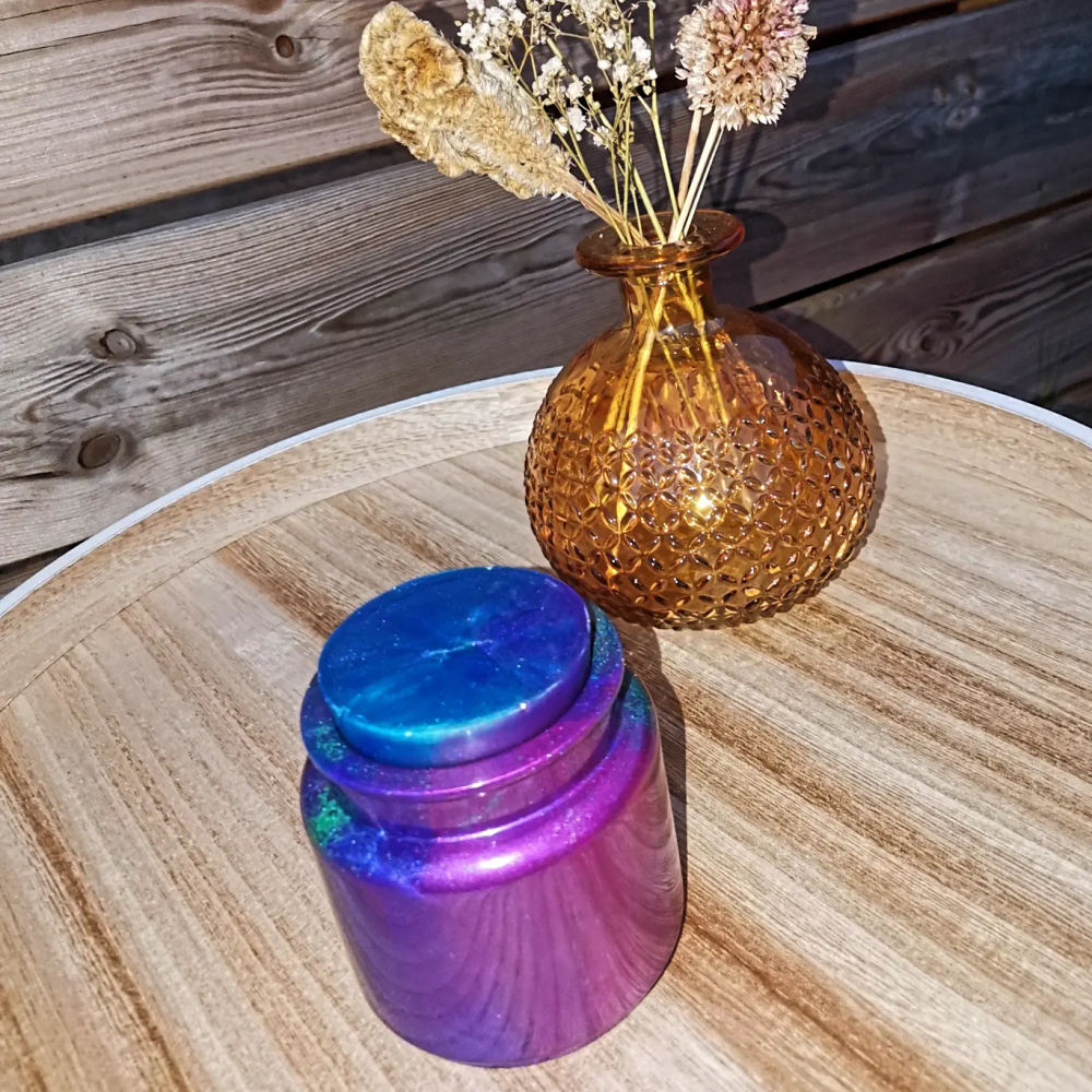 Deze urn met een sluiting die lijkt op die van een kurk, is een van de 7 epoxy urnen in ons assortiment zit.